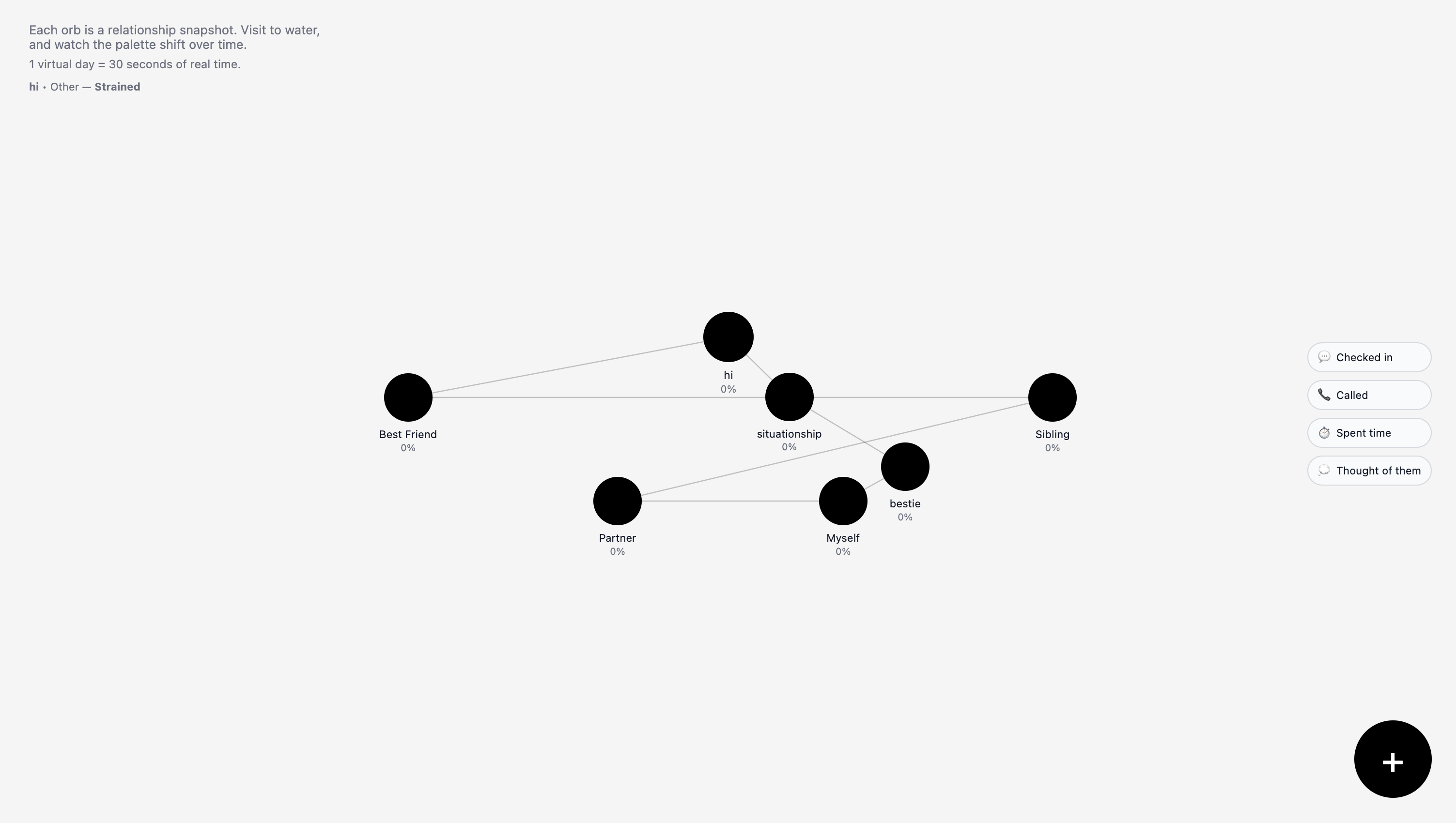 For this project, I designed a virtual relationship garden where each plant represents a meaningful connection in the user’s life. The plants are abstract forms that grow and change based on interaction data—such as check-ins, time spent together, or shared moments. “Watering” symbolizes intentional effort, like reaching out or reflecting on a memory, which helps the plant grow. Over time, consistent care makes the plant more vibrant, while neglect causes it to fade. Each relationship has its own record, allowing users to plant new connections and build a living ecosystem that visually demonstrates how relationships thrive through attention and care.