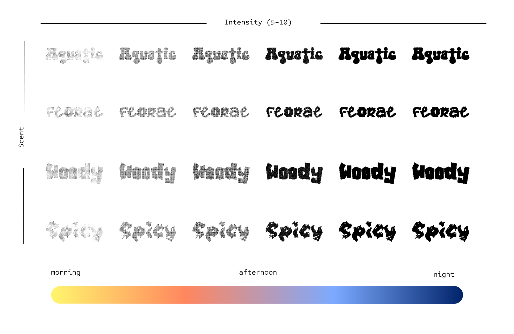 For this project, I reimagined the packaging system for Le Labo, a fragrance house known for its minimalist aesthetic and emphasis on craft, personalization, and sensory depth. Rather than treating each perfume as a static label, I designed an automated visual system that translates each scent’s inherent data—such as scent family, intensity, longevity, and key notes—into a dynamic, generative label. The system uses structured data to produce unique compositions that visually embody the sensory profile of each fragrance, allowing the packaging to function as both information and experience. Inspired by Le Labo’s laboratory-style typography and raw materiality, my design maintains the brand’s utilitarian tone while introducing a data-driven layer that makes the invisible qualities of scent visible. The result is a cohesive yet flexible packaging set that can expand infinitely as new fragrances are added, reinforcing both individuality and system consistency.